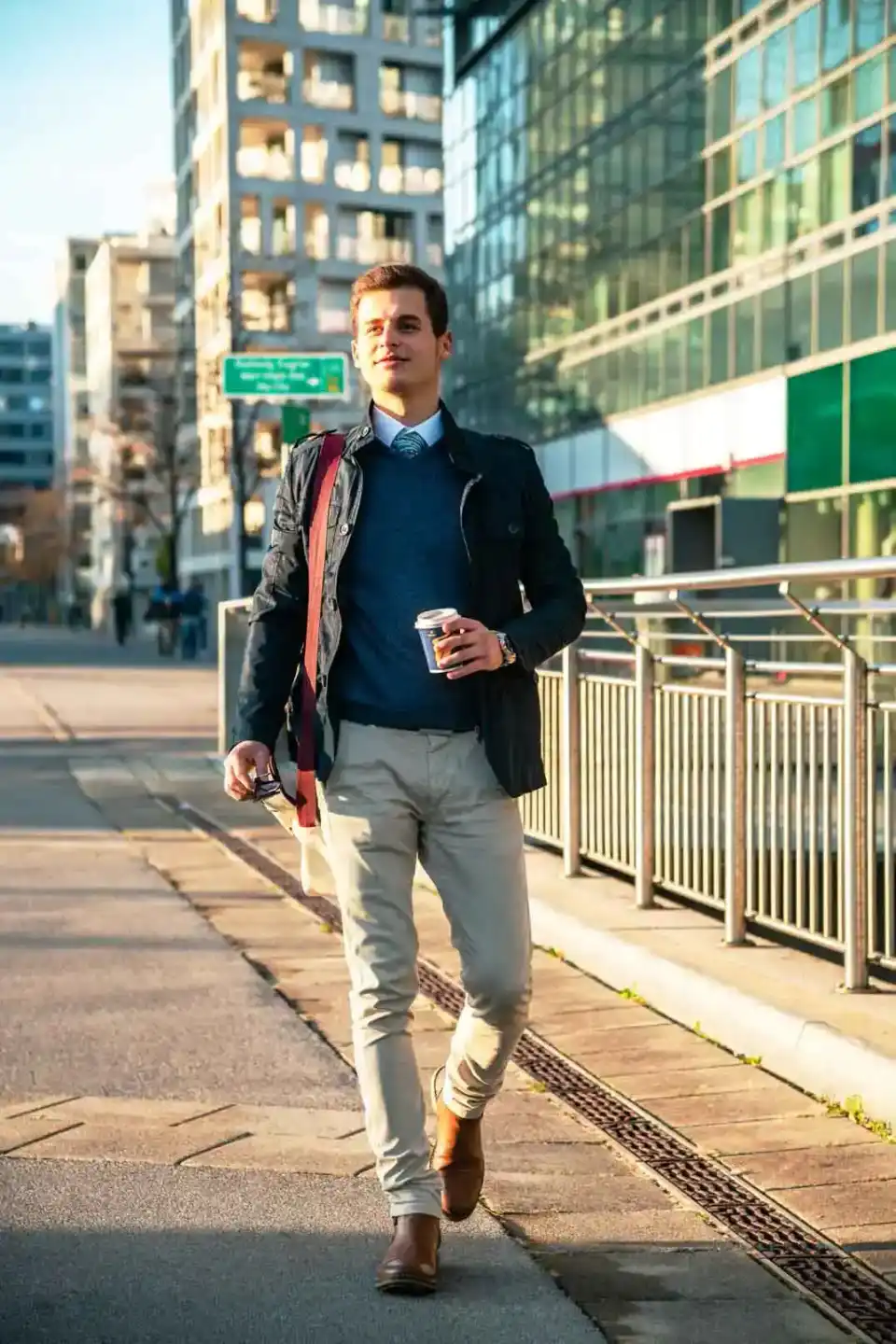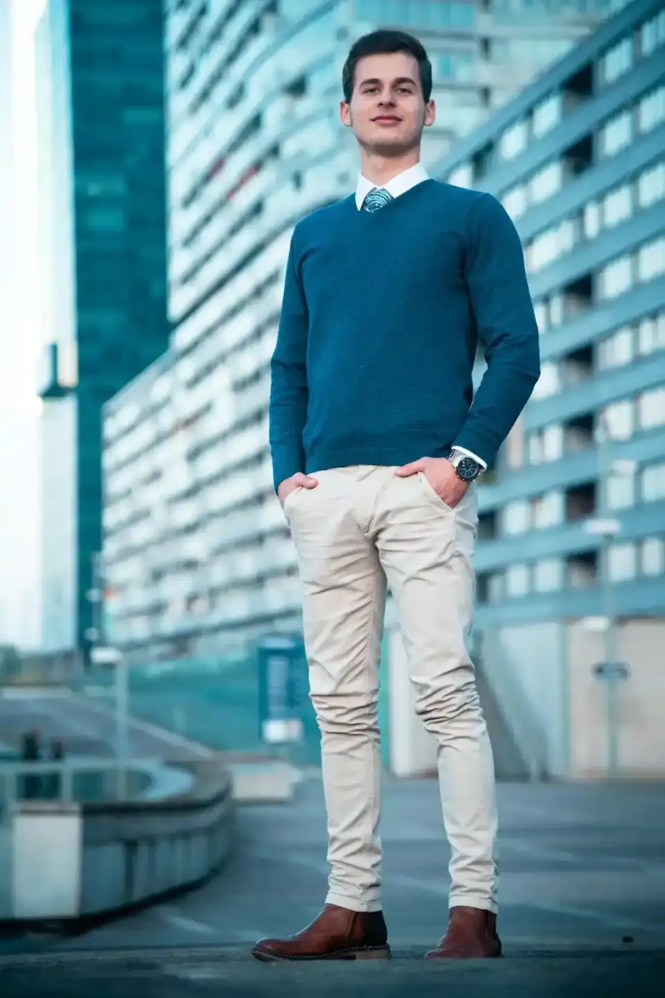 Junger Mann in blauem Pullover und beiger Hose vor modernem Hochhaus-Hintergrund – professionelles Portrait Wien