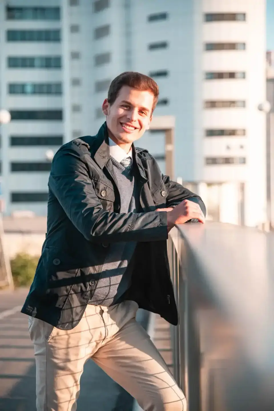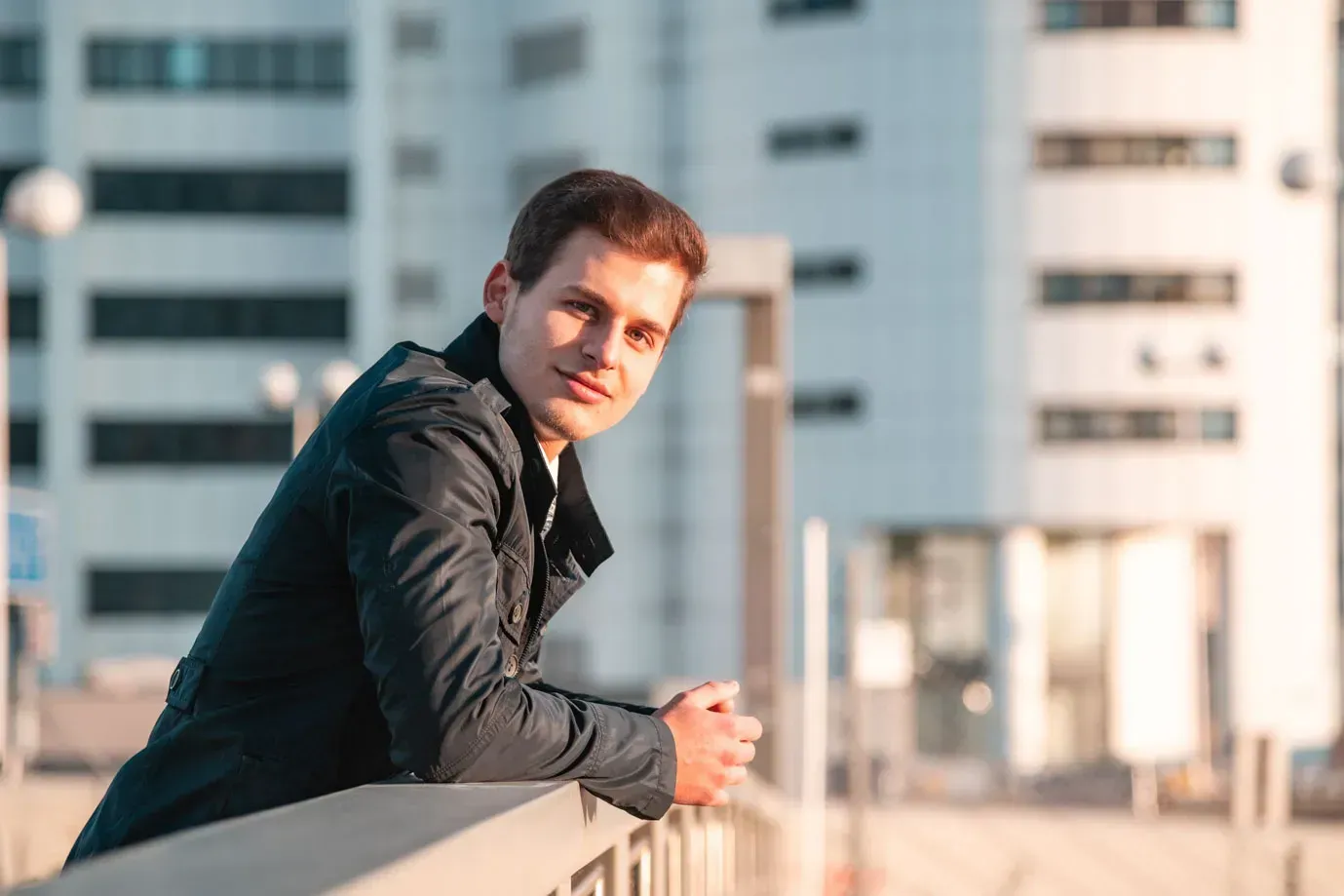 Junger Mann in schwarzer Jacke und grauem Hemd lehnt lächelnd an Geländer mit Hochhäusern im Hintergrund - Portraitfotograf W