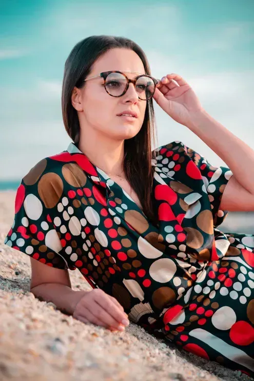 Frau in farbenfrohem Kleid mit Muster sitzt am Strand, trägt Sonnenbrillen – Beispiel für professionelle Produktfotografie Wi