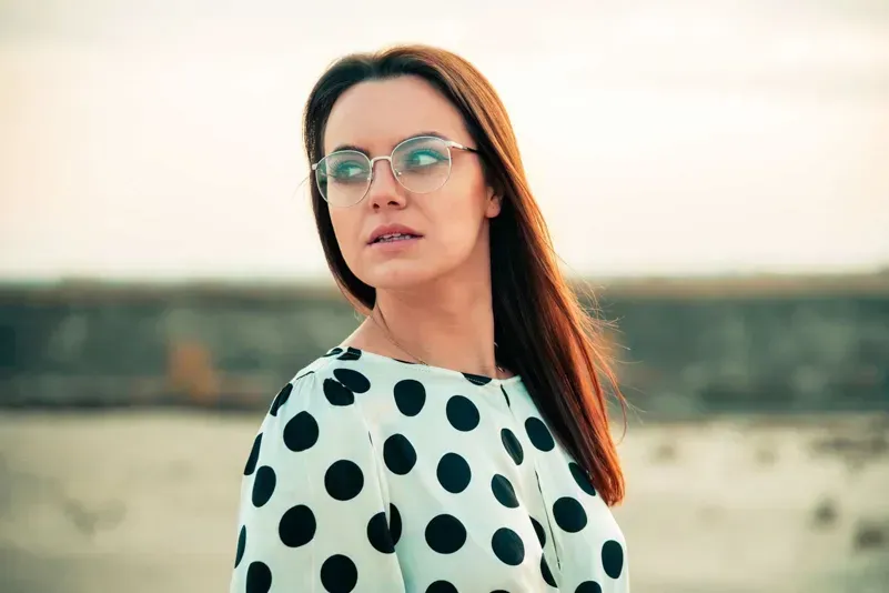 Junge Frau mit Brille und rötlichen Haaren trägt gepunktetes Shirt an Wasserkante, Produktfotografie Wien