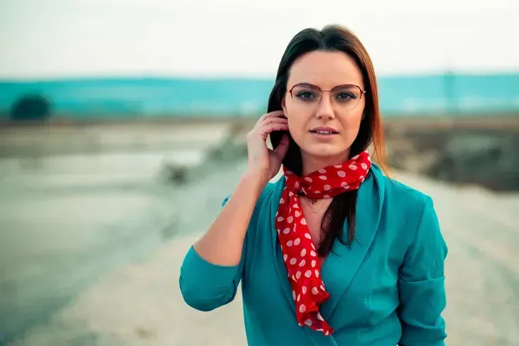 Frau mit Brille in türkisblauem Blazer und rotem Schal telefoniert in ländlicher Landschaft – Werbefotografie Wien