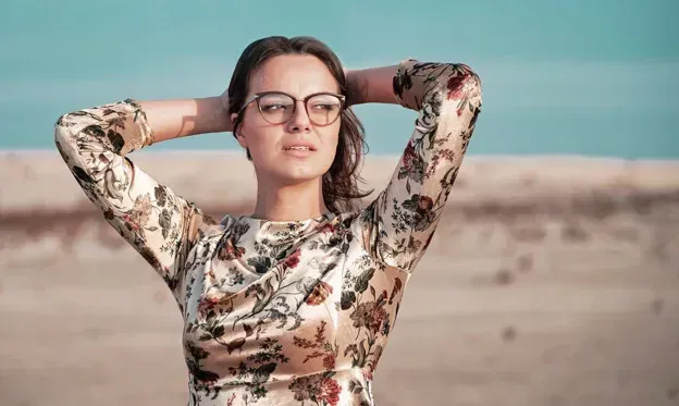 Junge Frau mit Brille und gemustertem Kleid posiert am Strand – professionelle Werbefotografie Wien