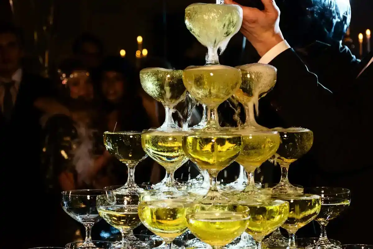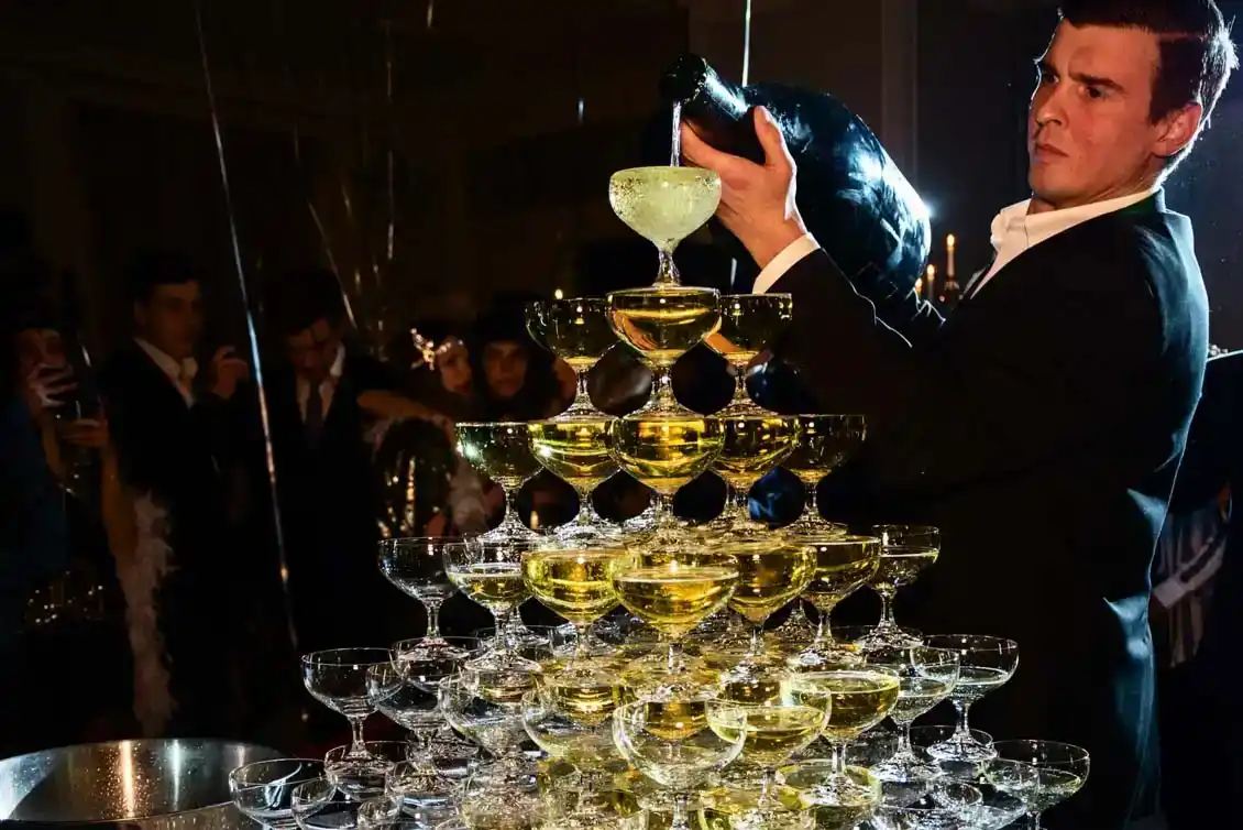 Elegante Champagnerpyramide bei Firmenevent Wien mit Mann in Smoking, der Gläser arrangiert