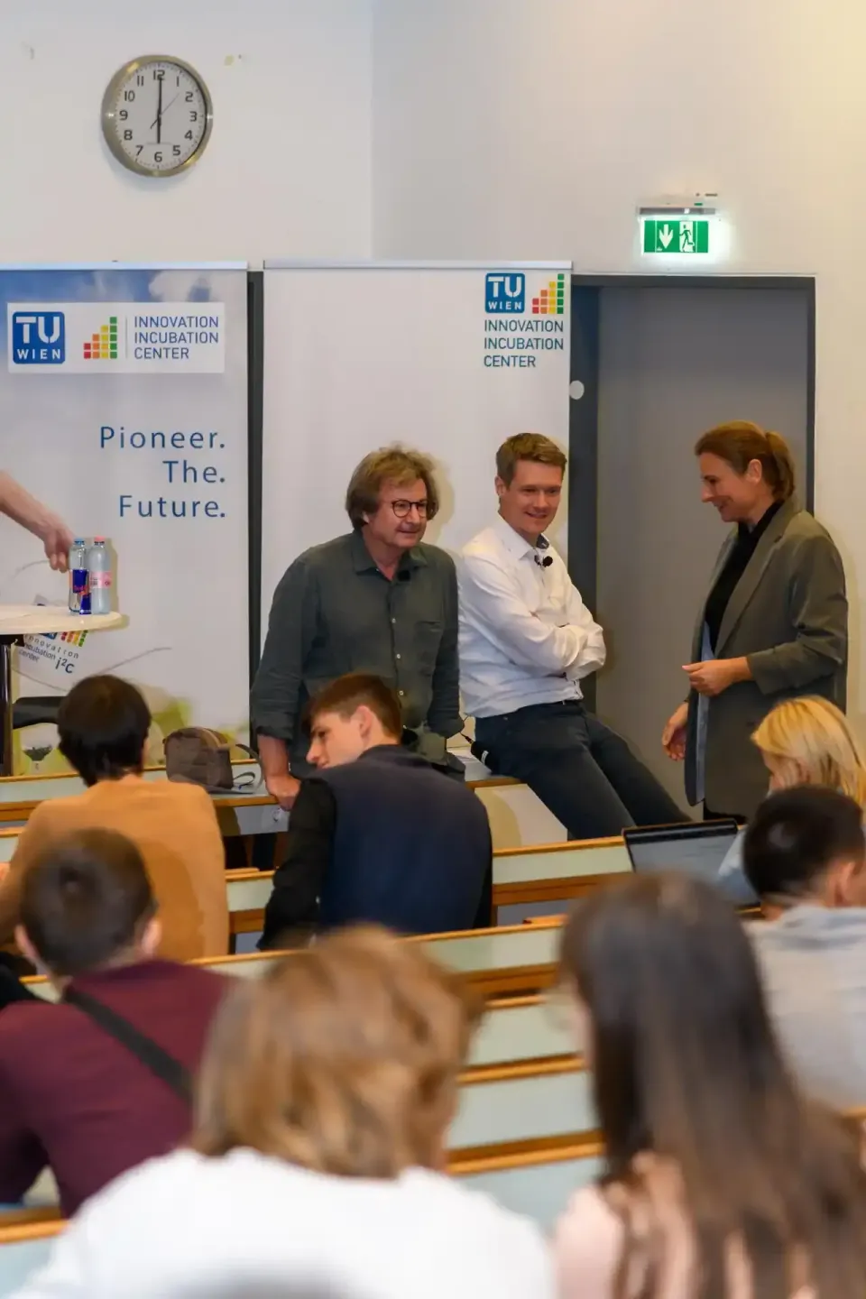 Eventfotograf dokumentiert Präsentation an der TU Wien Innovation Incubation Center mit drei Sprechern vor Publikum