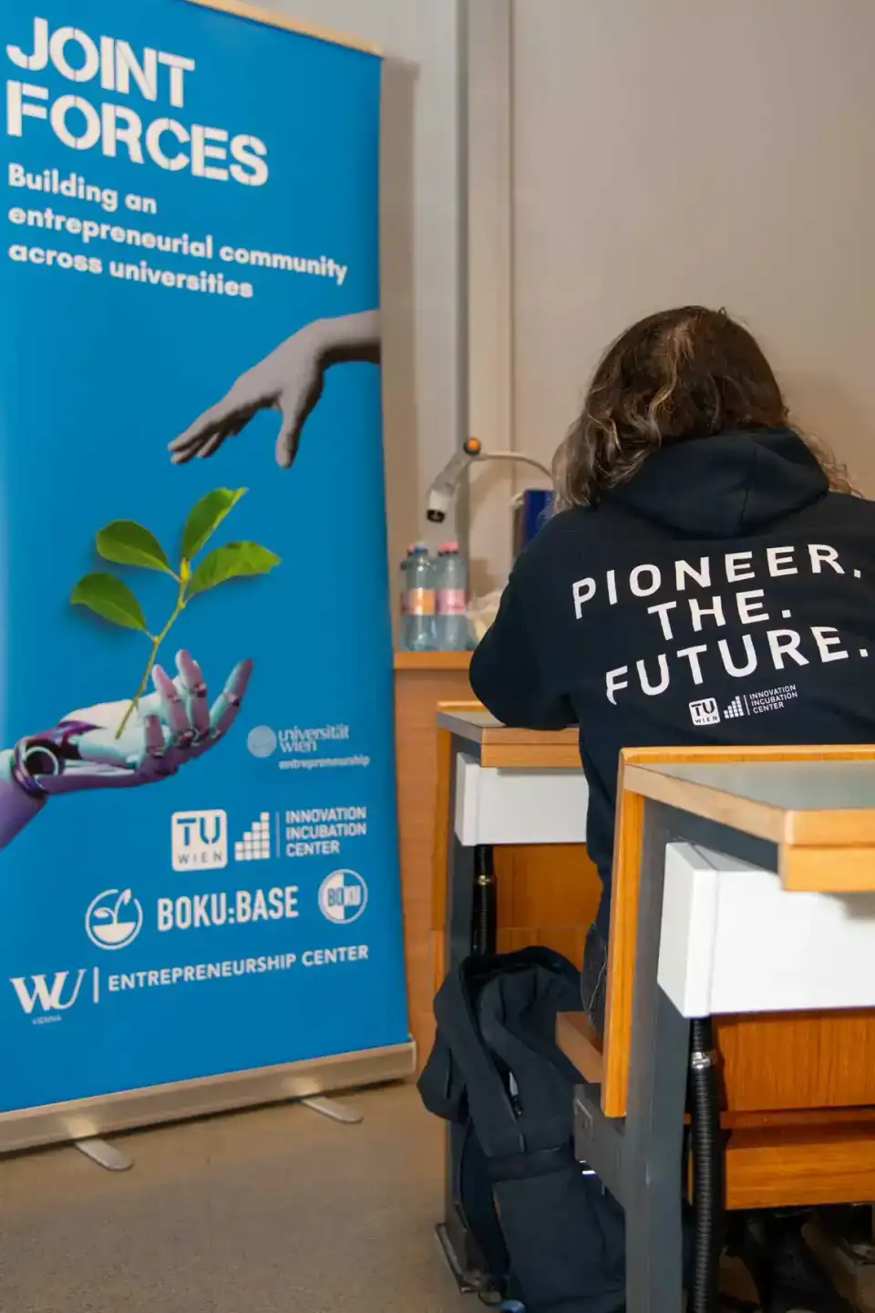 Teilnehmerin bei der Joint Forces Veranstaltung der TU Wien liest Informationen auf dem Plakat eines Eventfotografen Wien