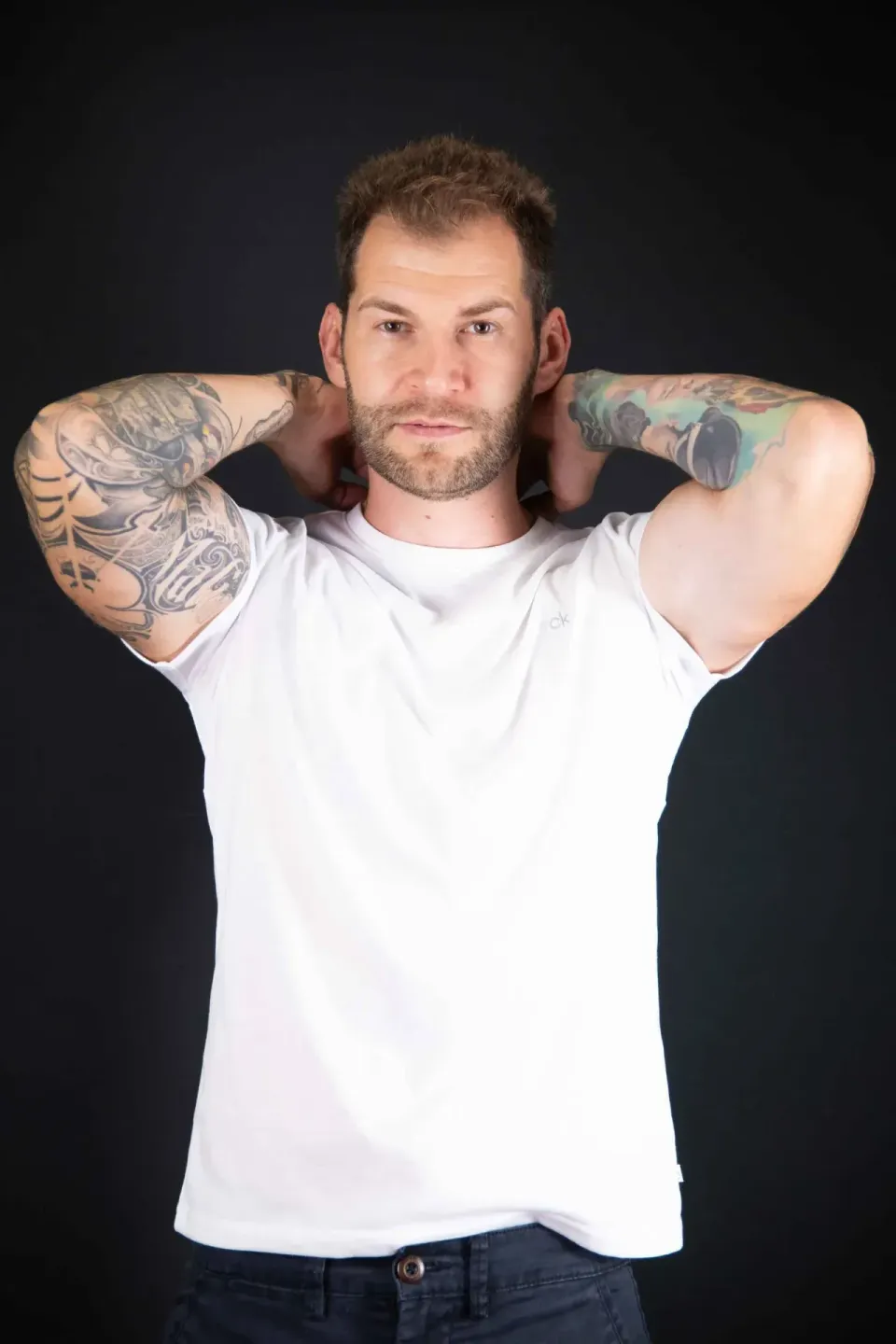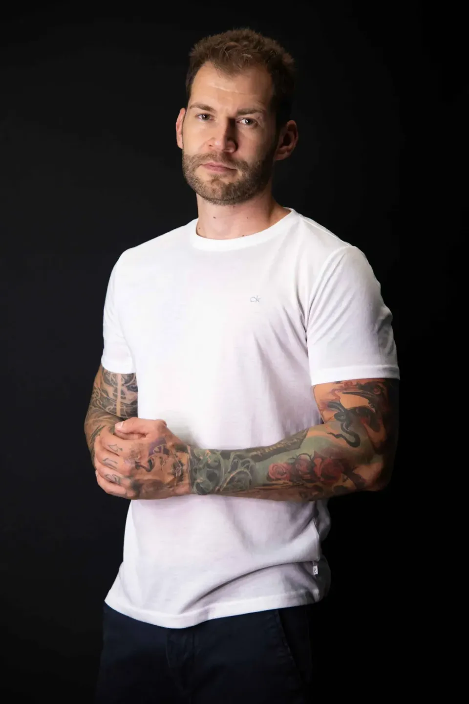 Portrait eines Mannes mit Tattoos auf beiden Armen, weißem T-Shirt vor schwarzem Hintergrund - Portraitfotograf Wien