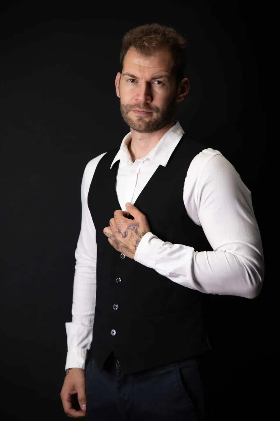 Professionelles Portrait eines Mannes im schwarzen Anzugweste und weißem Hemd für Bewerbungsfotos Wien