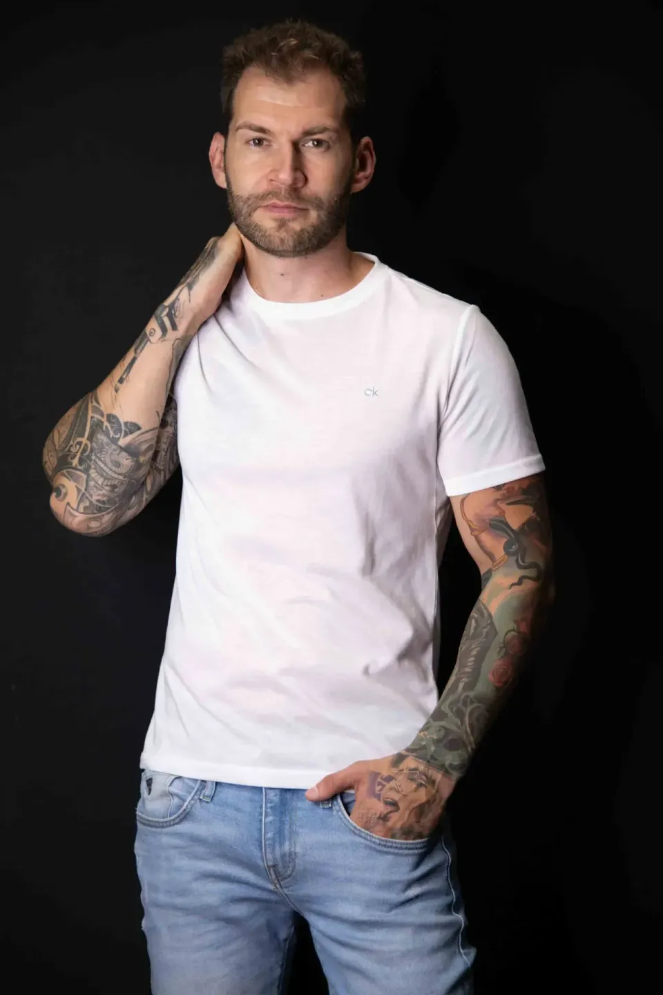 Portrait eines Mannes mit Tattoos in weißem T-Shirt und Jeans vor schwarzem Hintergrund - Portraitfotograf Wien