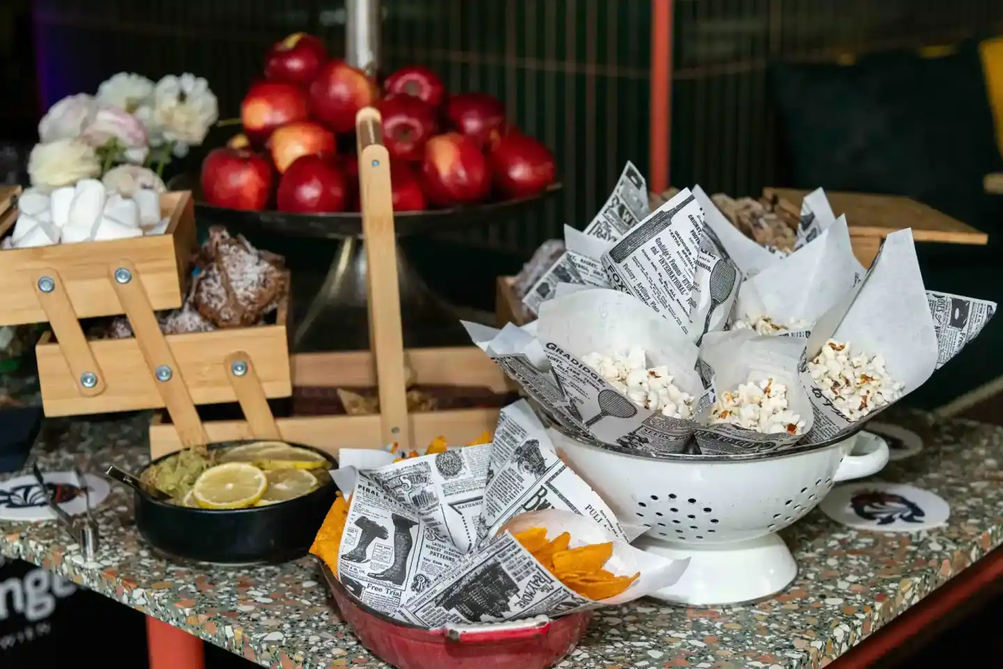 Bunte Eventdekoration mit roten Äpfeln, Popcorn in Papiertüten und Blumenarrangement auf einem Tisch – Eventfotografie Wien