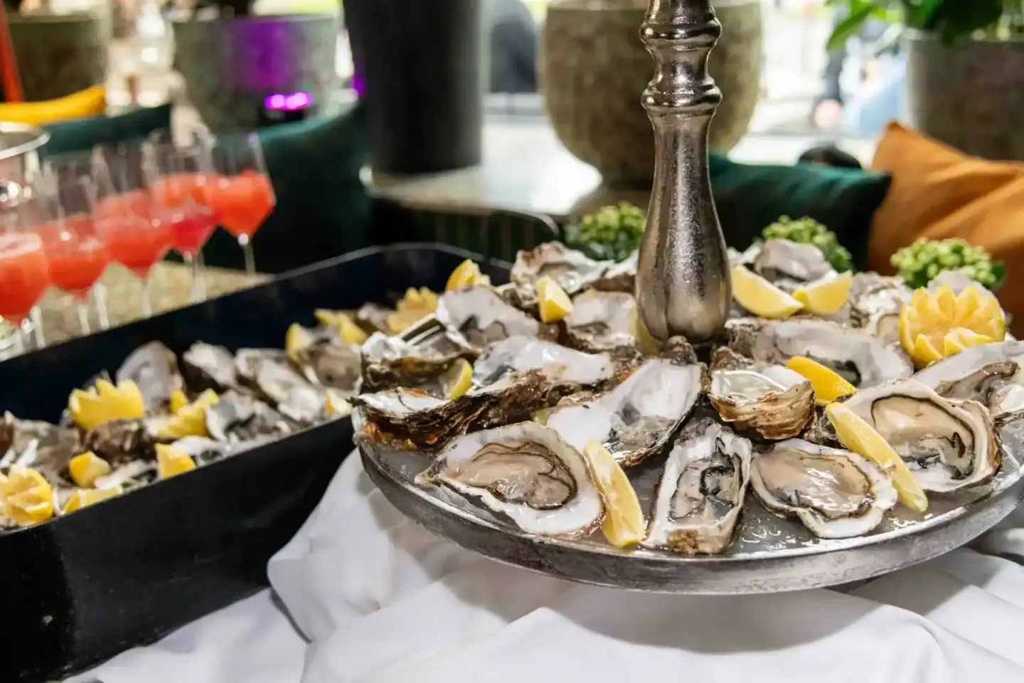 Elegante Austernplatte mit Zitronenscheiben und Champagnerflasche bei Firmenevent Wien, im Hintergrund Cocktails und festlich