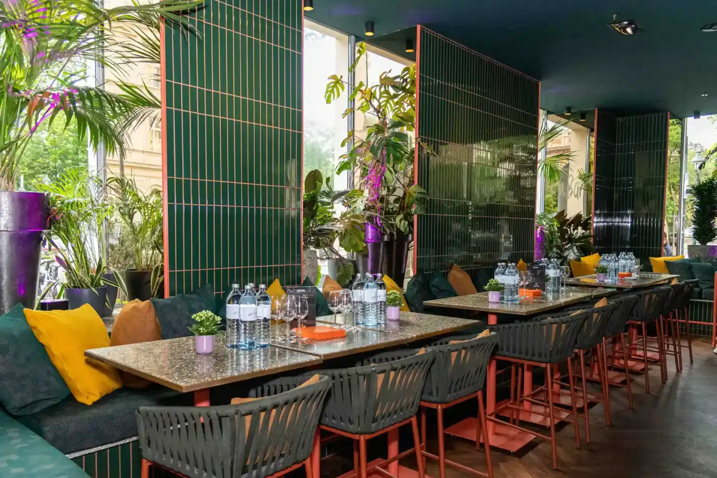 Moderner Konferenzraum mit grünen Gitterwänden, langen Tischen und roten Barhockern – professionelle Eventfotografie Wien