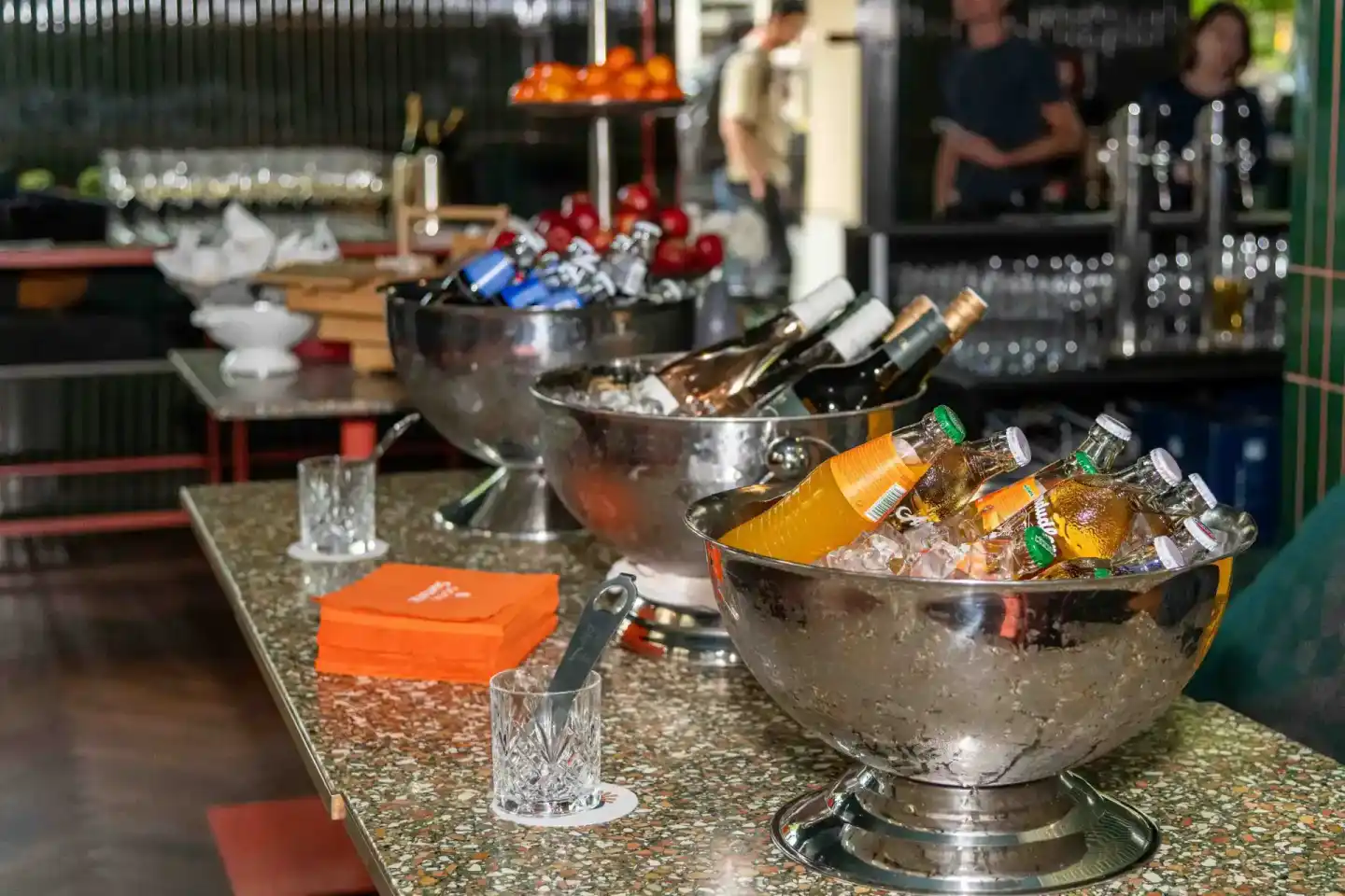 Elegante Getränkebar mit Champagnerflaschen in Eiskübeln und Gläsern bei einem Firmenevent Wien